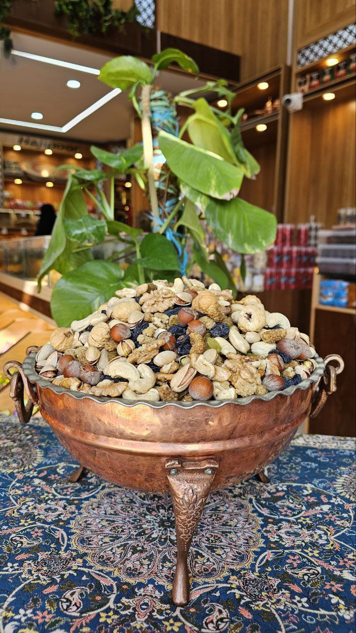 شامل ،بادام هندی، بادام پوست کاغذی، توت خشک، انجیر خشک، برگه زردآلو، مویز بدون هسته، کشمش سایه خشک،برگه زردآلو، فندق ،پسته دستچین